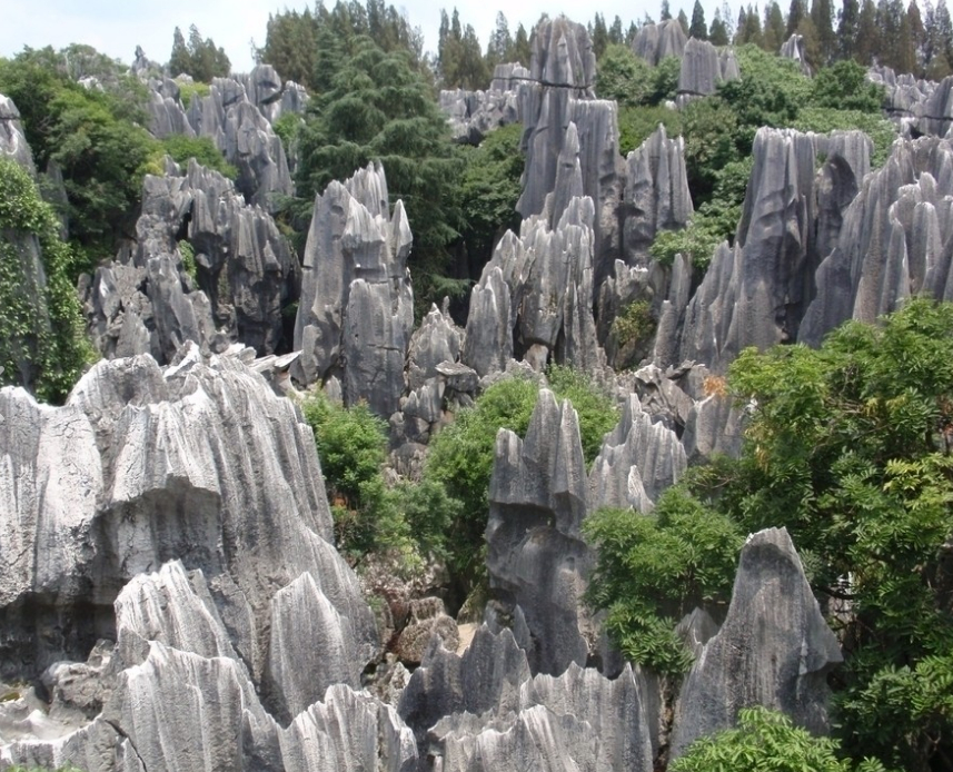 石林:又称为云南石林,和北石林内蒙的阿斯哈图石林相对应。昆明石林以石多似林而闻名,景区范围广阔,景点众多,有石林风景区、黑松岩(乃古石林)风景区、飞龙瀑(大叠水)风景区、长湖风景区、月湖风景区、芝云洞风景区、奇风洞风景区、圭山国家森林公园等。其中已开发为游览区的是:石林风景区、黑松岩(乃古石林)风景区、飞龙瀑(大叠水)风景区、长湖风景区。2亿7千万年前,石林大地上崛起了千余平方公里的石头“森林”,是石头铸就的大海,是岩石雕塑的森林。是一座名副其实的由岩石组成的“森林”,穿行其间,但见怪石林立,突兀峥嵘,姿态各异。由于石灰岩的作用,石柱彼此分离,又经过常年的风雨侵蚀,无数的石峰、石柱、石笋、石芽、形成了集奇石、瀑布、湖泊、溶洞、峰丛和丘陵于一身而显得千姿百态的石林。